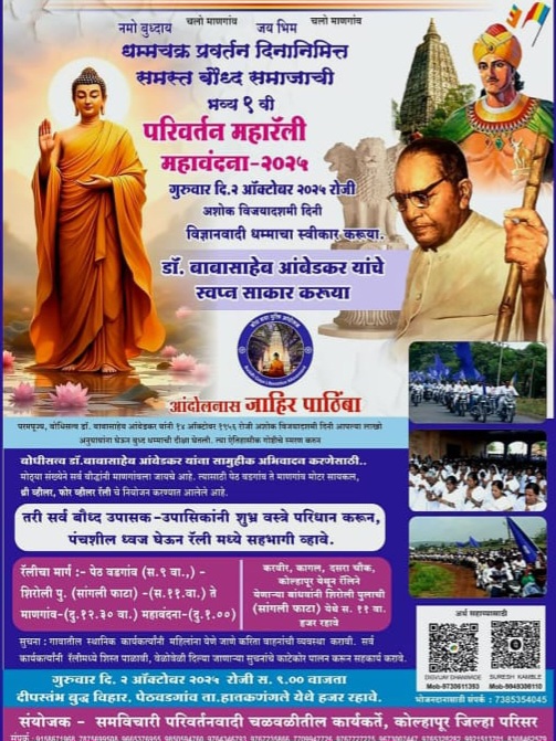 यावर्षी गुरूवार दि.०२ ऑक्टोंबर २०२५ रोजी धम्मचक्र प्रवर्तन दिनाला ६९ वर्षे पूर्ण होत आहे. त्यानिमित्ताने याही वर्षी भव्य धम्मचक्र प्रवर्तन महारॅली आयेजित केलेली आहे.