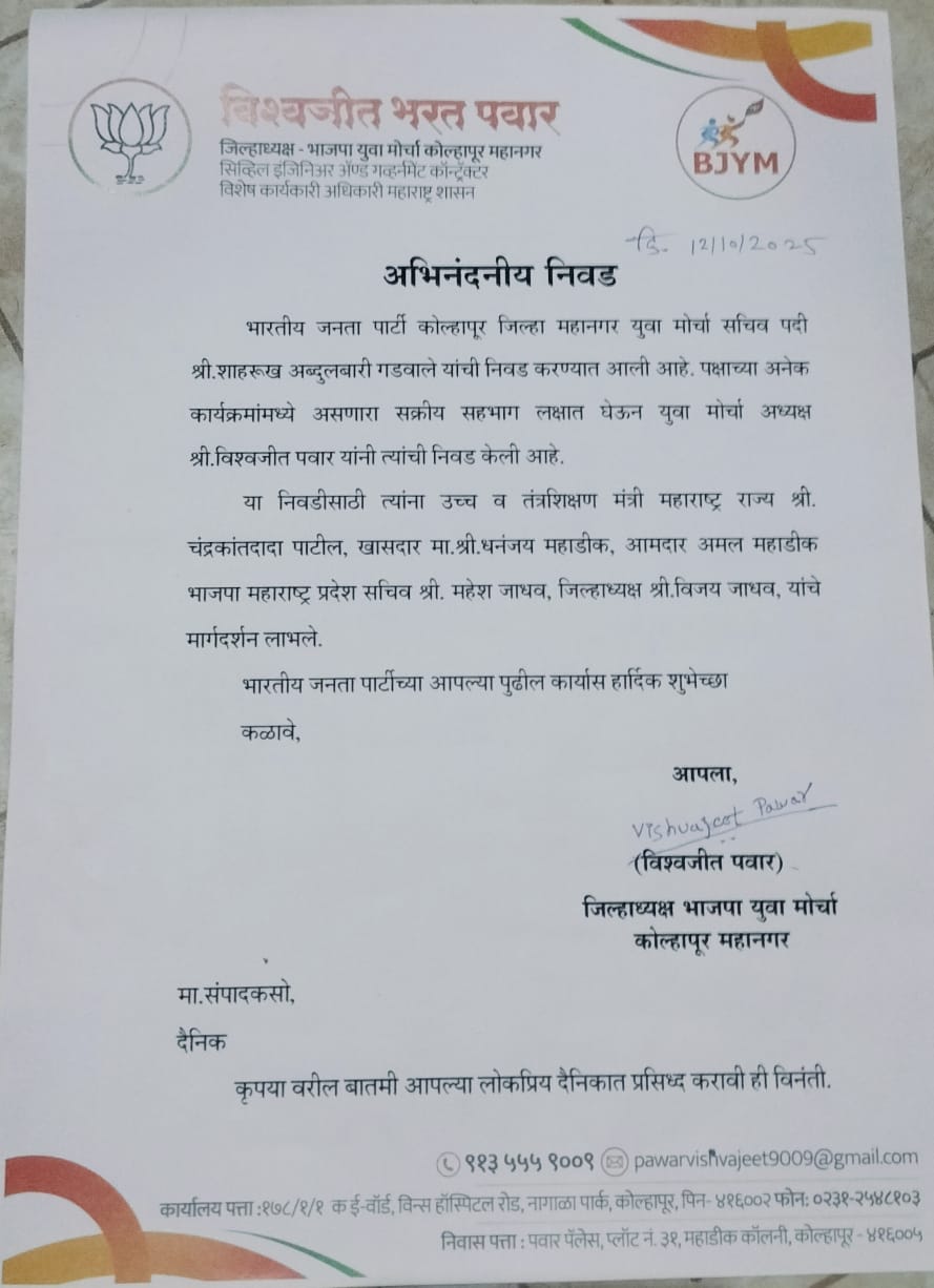 भारतीय जनता पार्टी कोल्हापूर जिल्हा महानगर युवा मोर्चा सचिव पदी शाहरुख अब्दुलबारी गडवाले यांची निवड करण्यात आली पक्षाच्या अनेक कार्यक्रमांमध्ये असणारा सक्रिय सहभाग लक्षात घेऊन युवा मोर्चा अध्यक्ष श्री. विश्वजीत पवार यांनी त्यांची निवड केली आहे.या निवडीसाठी त्यांना उच्च व तंत्रशिक्षण मंत्री महाराष्ट्र राज्य चंद्रकांतदादा पाटील, खासदार धनंजय महाडिक , आमदार अमल महाडिक, भाजपा महाराष्ट्र प्रदेश सचिव महेश जाधव, जिल्हाध्यक्ष विजय जाधव मार्गदर्शन लाभले.