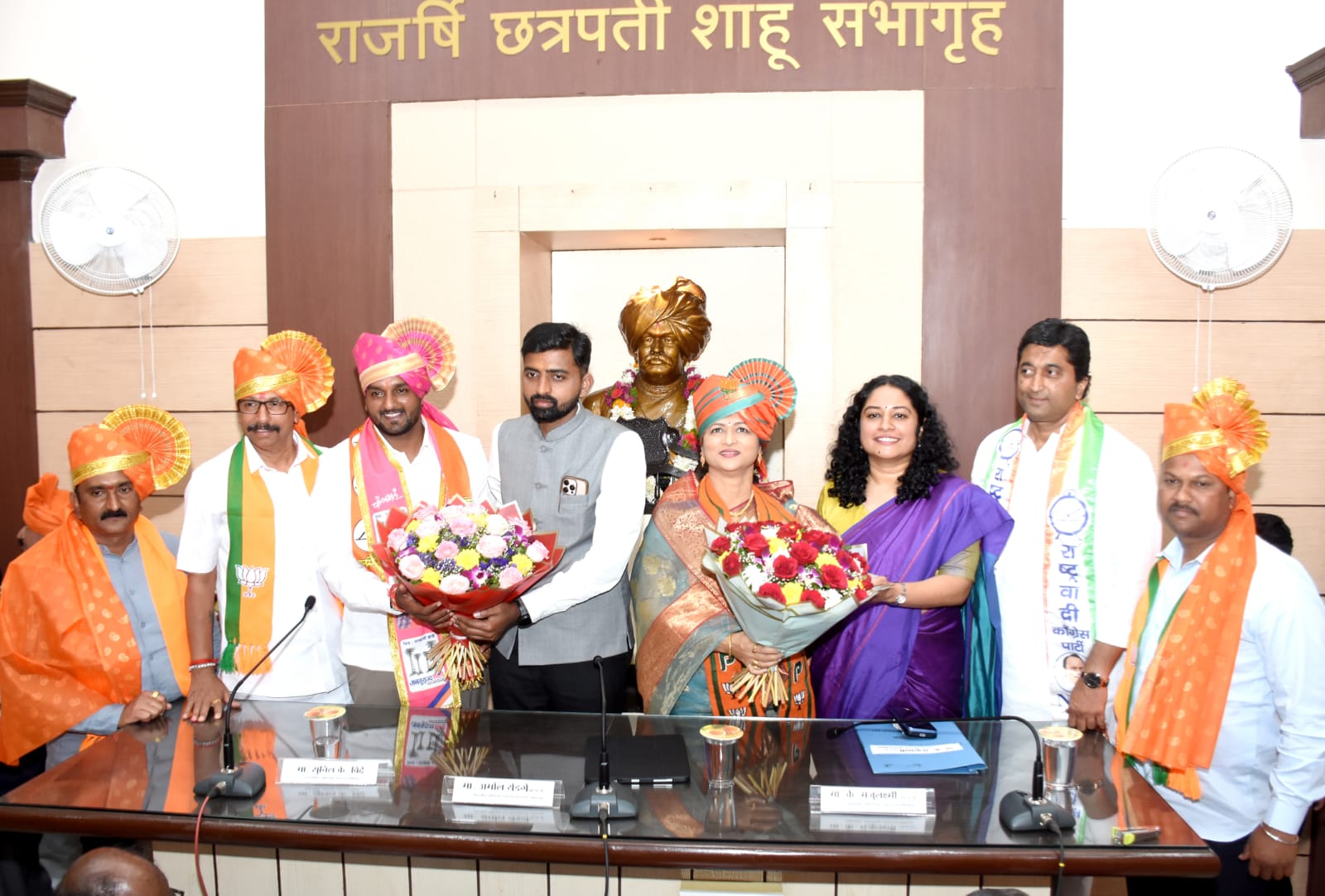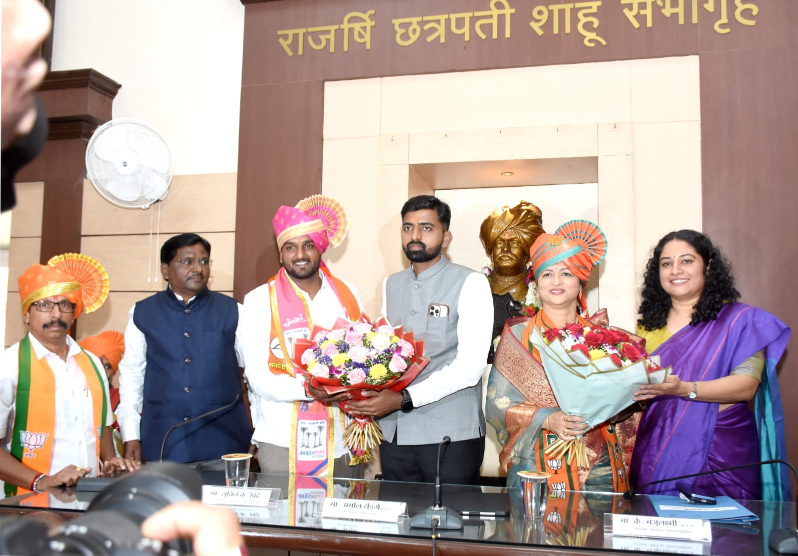 यावेळी पिठासन अधिकारी तथा जिल्हाधिकारी अमोल येडगे, आयुक्त के.मंजूलक्ष्मी, उपजिल्हाधिकारी संपत खिलारी, अतिरिक्त आयुक्त रविकांत आडसूळ, नगरसचिव सुनिल बिद्रे, अधिकारी, नगरसेवक/ नगरसेविका यांनी नुतन महापौर व उपमहापौरांचे पुष्पगुच्छ देऊन अभिनंदन केले
